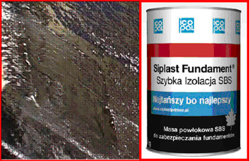 Siplast Fundament Szybka Izolacja SBS - nowa masa powłokowa w wysokim stopniu modyfikowana SBS, służąca do wykonywania powłokowych zabezpieczeń hydroizolacyjnych podziemnych części budynku w przypadku niskiego poziomu wód gruntowych nie wywołujących parcia hydrostatycznego na elementy podziemne budynku. Specyficzny skład masy powoduje, że posiada ona konsystencję gęstej śmietany i pozostaje elastyczna w okresie eksploatacji pokrywając drobne spękania i szczeliny. Powierzchnia masy po wysmarowaniu pozostaje przez długi okres czasu kleista co pomaga w mocowaniu do ścian fundamentowych mat drenarskich.